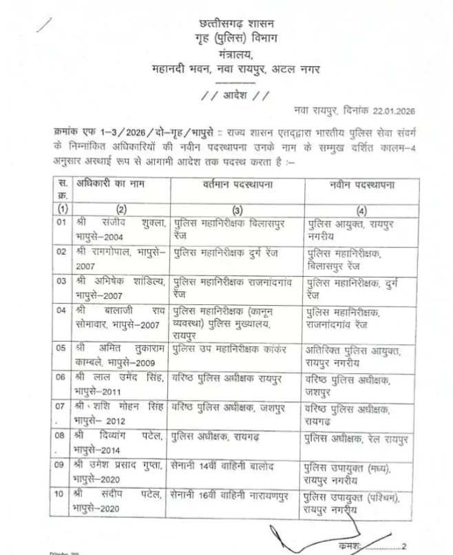 इस क्रम में रायपुर के वरिष्ठ पुलिस अधीक्षक (SSP) डॉ. लाल उम्मेद सिंह का तबादला जशपुर जिले में किया गया है। वहीं, संजीव शुक्ला को रायपुर का पहला पुलिस कमिश्नर नियुक्त किया गया है, जो राजधानी की कानून-व्यवस्था की कमान संभालेंगे।